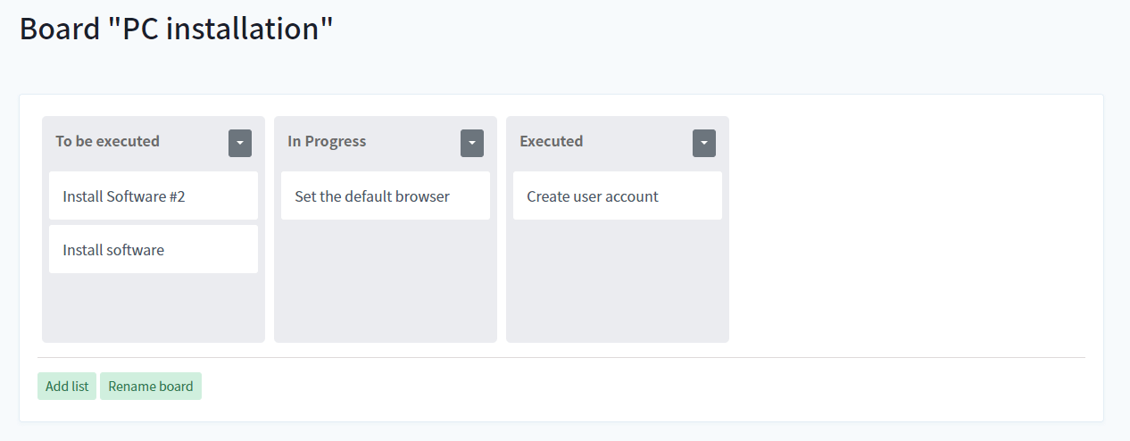 Boards allows you to create boards with lists and cards (kanban board). You can add lists like "To be executed", "In Progress", and "Executed". You can pre-fill it with cards like "Change the default browser". You also link those boards to projects, so they are created automatically when the engineer executes that project. The created board will be a copy of your board, so they can fill it in.